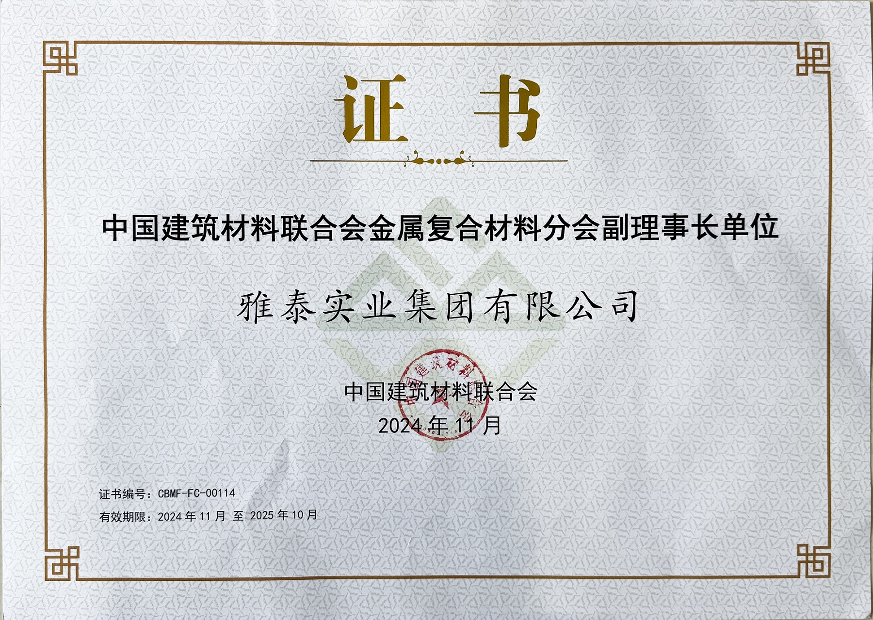 同時(shí),雅泰實(shí)業(yè)集團(tuán)作為幕墻行業(yè)優(yōu)秀的國內(nèi)老字號(hào)品牌,也長年擔(dān)任著中國建筑材料聯(lián)合會(huì)理事、金屬復(fù)合材料分會(huì)副理事長等角色。
